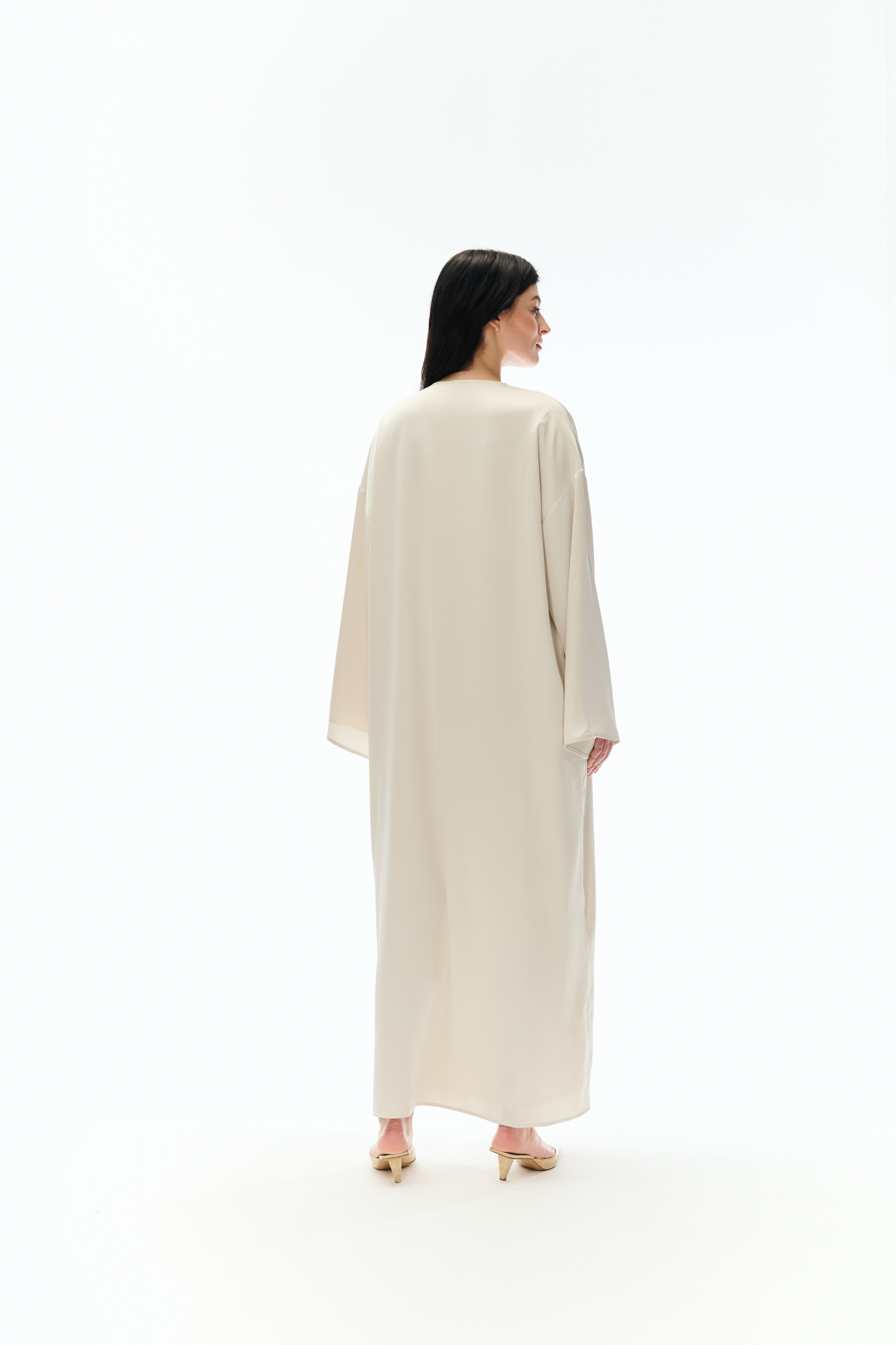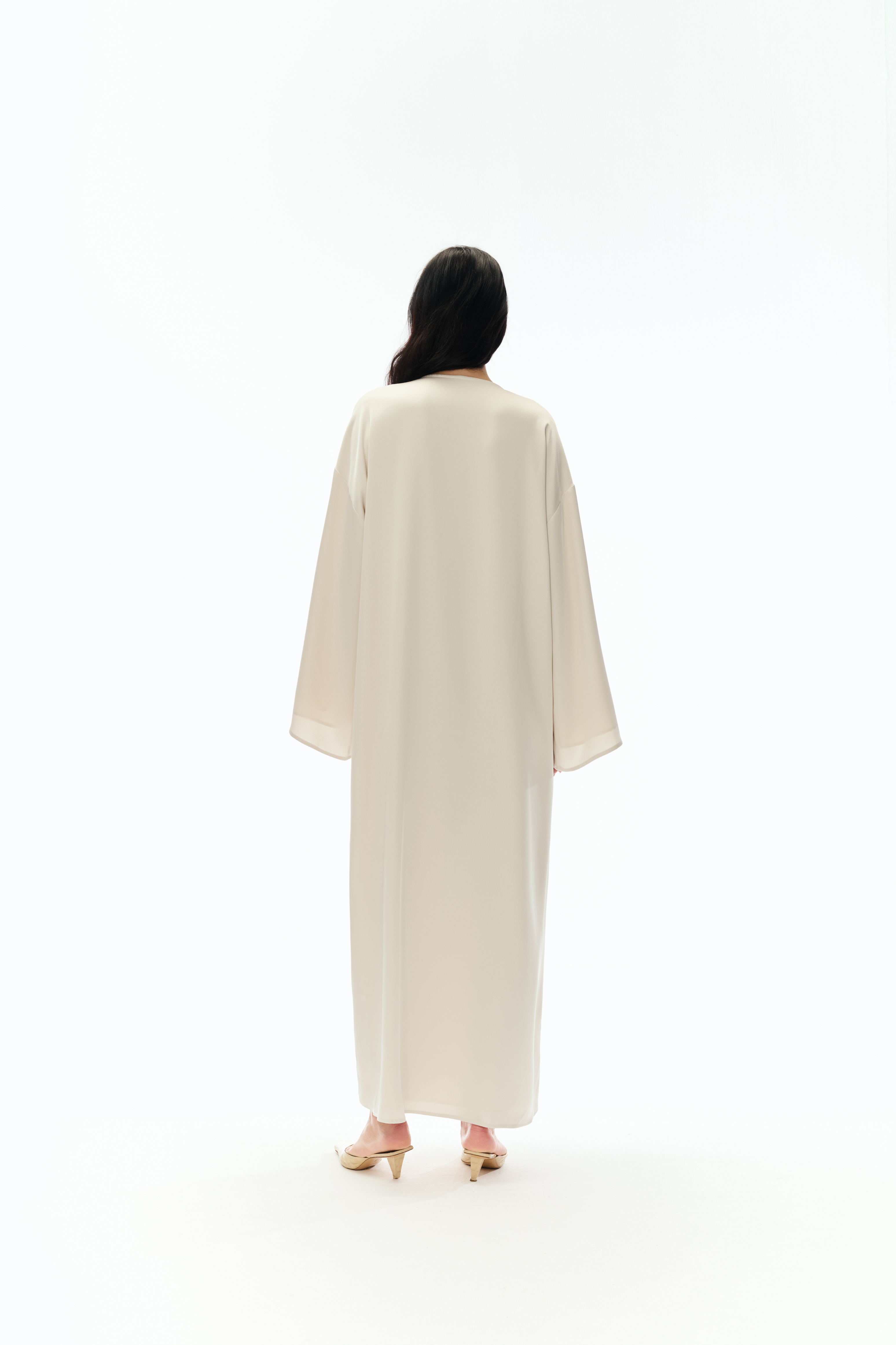 A row of delicate, tonal buttons adds a refined detail to the front, offering a hint of structure without compromising the abaya’s fluid movement. The clean, crisp white speaks to purity and poise — a versatile choice for both everyday grace and special moments.