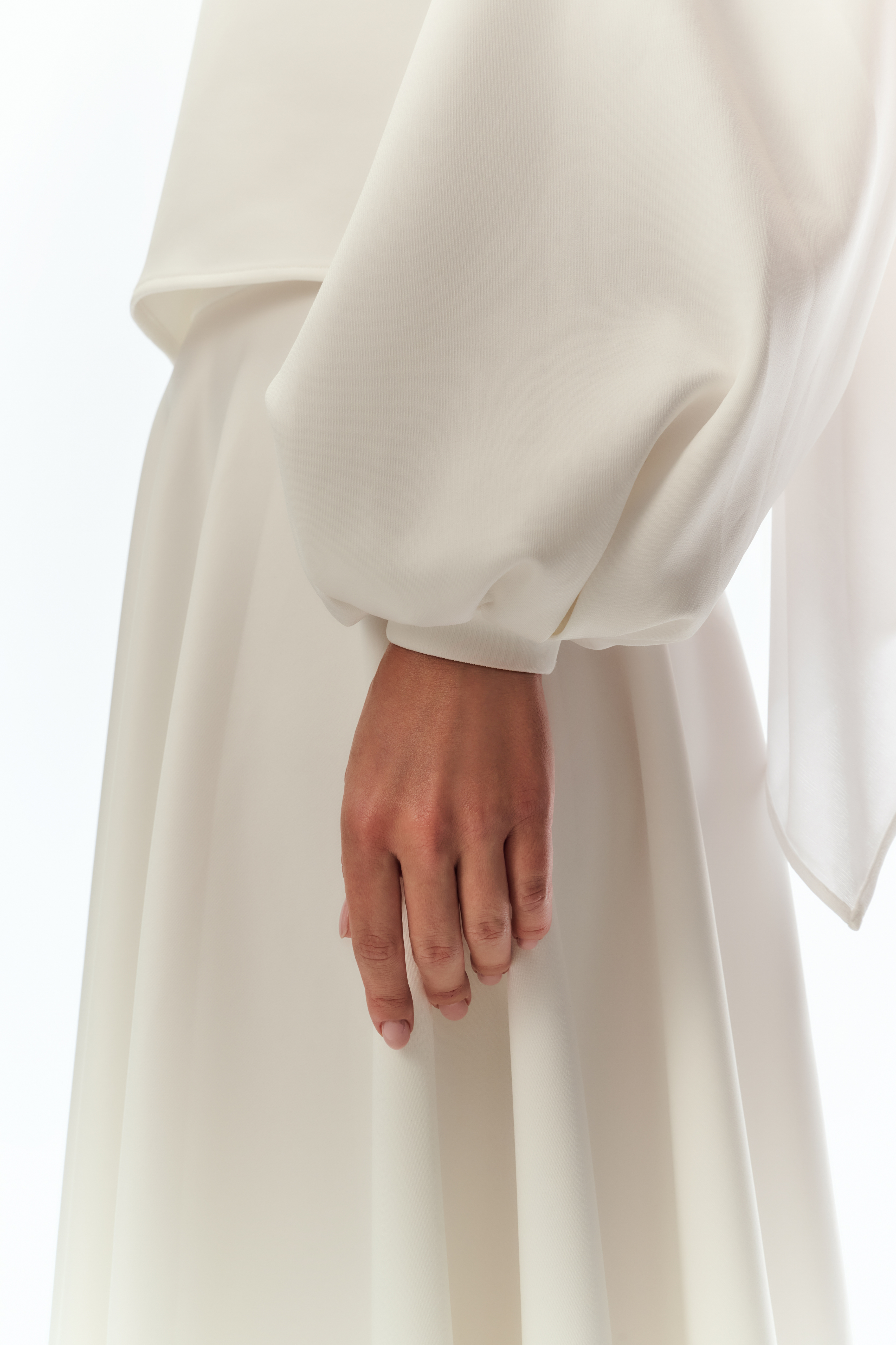 The blouse features voluminous puffed sleeves and a high neckline, creating a bold yet modest silhouette. Paired with a flowing, wide-cut skirt, the set moves effortlessly while maintaining a sculpted, polished shape. Discreet zippers at the back of both top and skirt ensure a seamless fit, allowing the design to speak without interruption.